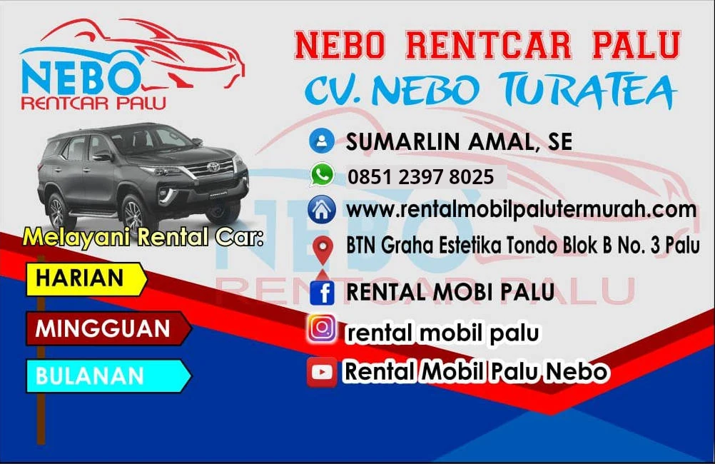 Rental Mobil Palu melayani penyewaan mobil baik lepas kunci atau dengan sopir. Kami adalah perusahaan yang sudah berpengalaman lebih dari 5 tahun dan berbadan hukum dibawah CV. NEBO TURATEA.